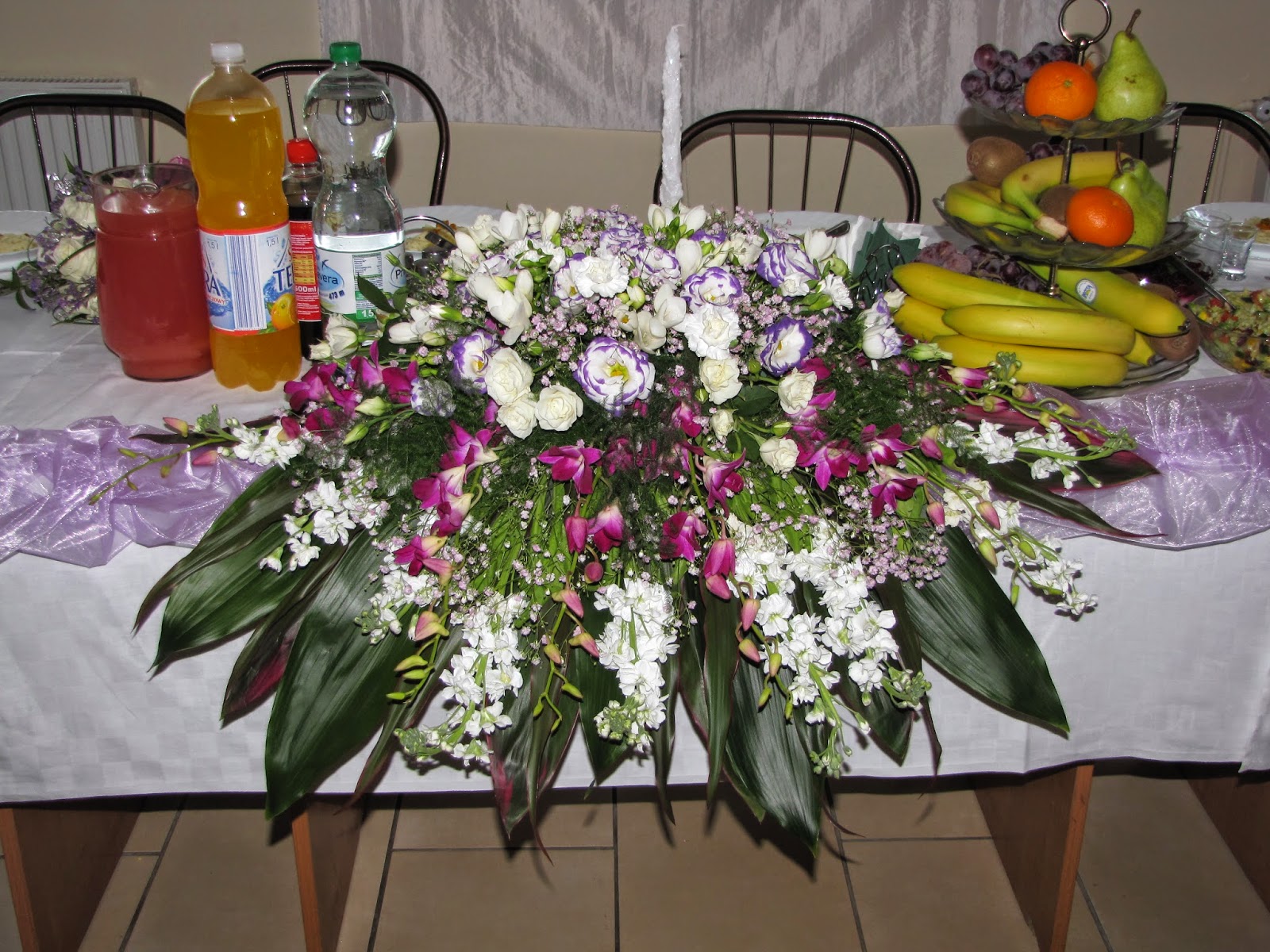 Przeglądając zdjęcia natrafiłam na kilka moich dzieł - bukiety wykonywane na ślub przyjaciółki. Bukiet główny na stół młodych i na samochód - storczyki, lewkonie, eustomy, frezje, gipsówka, goździki.